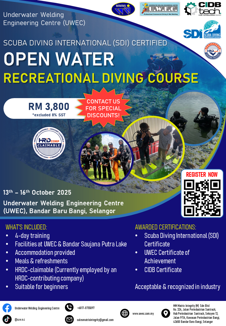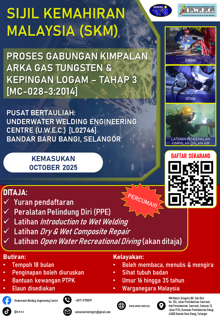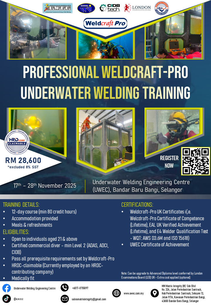 UWEC or Underwater Welding Engineering Centre that was registered in Kajang Selangor under MM Matrix Integrity (M) Sdn Bhd is a school approved and accredited by Weldcraft Pro United Kingdom that runs a unique and prestigious professional underwater welding course first ever in Malaysia and Asia.